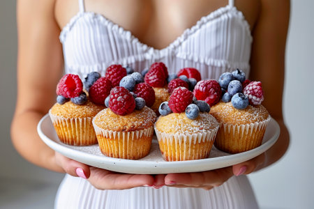 A woman is holding a plate of freshly baked cupcakes adorned with raspberries and blueberries. The airy kitchen setting highlights the delightful treats, inviting everyone to enjoy them..