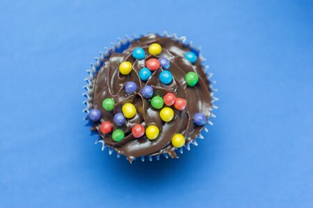 Delicious homemade cupcakes with Colorful cream and topping with candy and Chocolate Cookies. Homemade autumn holiday dessert