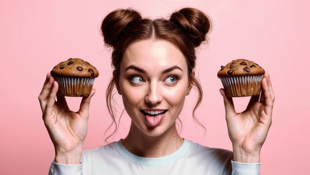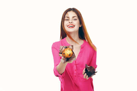 Portrait of a beautiful young woman holding two chocolate muffins on a pink background