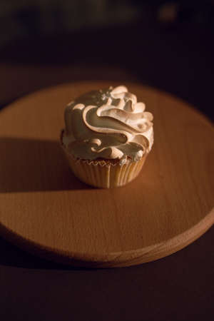 Cupcake isolated on wooden table. Cupcake in red paper mold.