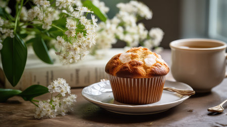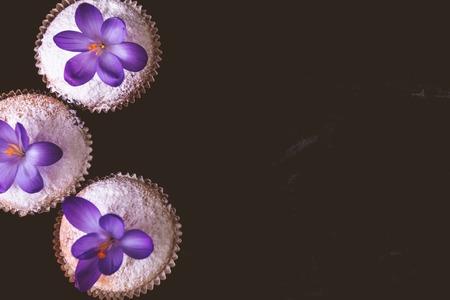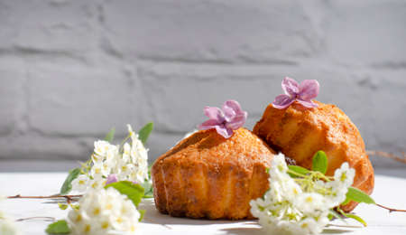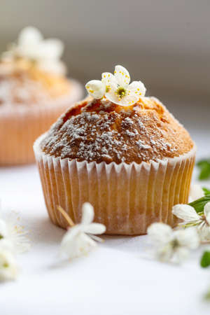 Sweet muffins with powdered sugar and blossoms. homemade bakery. Muffins in white capsules decorated with fruit tree flowers. springtime bakery.