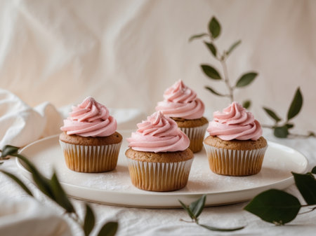 AI Generated. Three Pink Cupcakes on a White Plate with Leaves