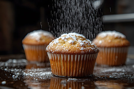 Deliciously golden muffins are artfully sprinkled with powdered sugar against a dark, moody backdrop. the mouthwatering texture and inviting appearance make this image ideal for baking inspiration and culinary advertising. Generative AI
