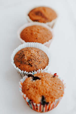 homemade muffins with different fillings on a light background. food for children's parties and tea