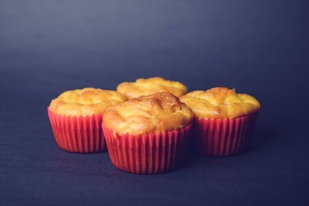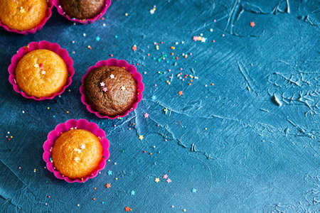 Set of vanilla muffins with chocolate cream filling. Blue stone background.