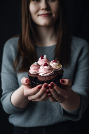 a person holding a plate with cupcakes in their hands on a red cloth with a black background and a red curtain behind it. . generative ai