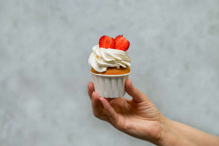 delicious cupcake decorated with strawberries in a female hand on a gray background, homemade handmade cakes