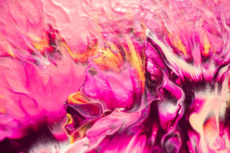 Wet marble. Ink blend. Blur neon pink red color shimmering texture liquid acrylic emulsion flow wave bright abstract art background.