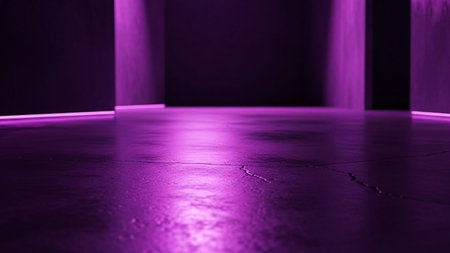 An atmospheric shot of an empty room with a concrete floor bathed in vibrant purple neon light. The light emanates from the edges of the walls, casting a strong glow and reflections on the floor. The concrete surface subtle cracks, adding a touch of texture to the otherwise smooth and polished appearance. The deep shadows and dramatic lighting create a futuristic and minimalist ambiance, a variety of conceptual or background uses. The low angle perspective emphasizes the vastness of the space.