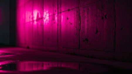 A striking of a grungy concrete wall bathed in intense, vibrant pink neon light. The rough texture of the concrete is highlighted by the artificial illumination, creating dramatic shadows and highlights. A wet floor in the foreground reflects the pink glow, adding to the moody and atmospheric urban scene. The overall effect is modern, edgy, and visually impactful.