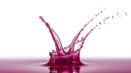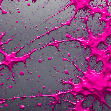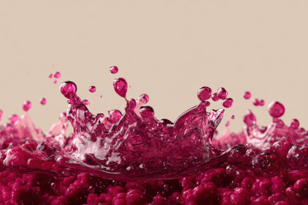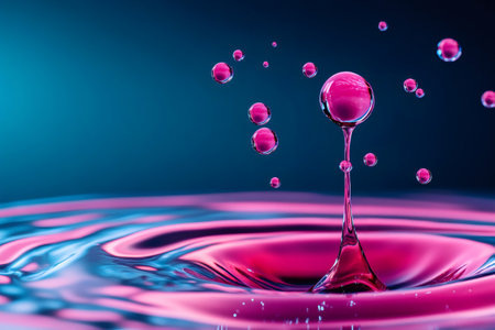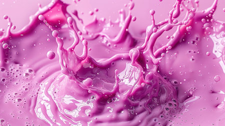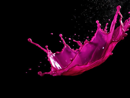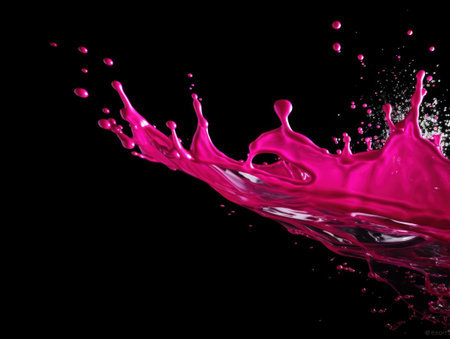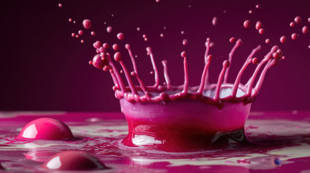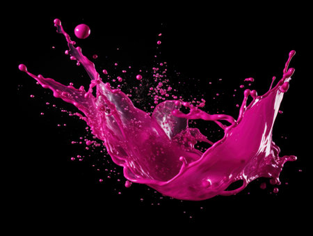 Vibrant pink liquid splash with droplets on monochrome backdrop