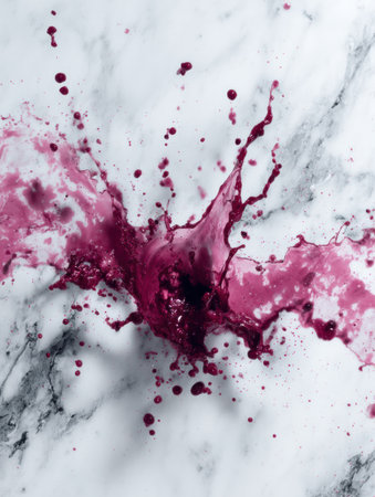 A vibrant splash of beet juice is artistically displayed across a white marble surface, highlighting the contrast between the deep color and smooth texture.