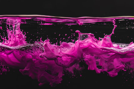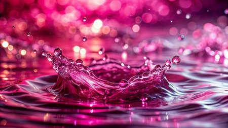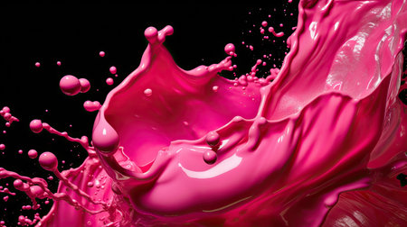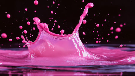 A striking close-up of a vibrant pink liquid splash, showcasing dynamic droplets against a rich dark backdrop, perfect for creative projects.