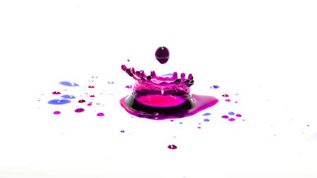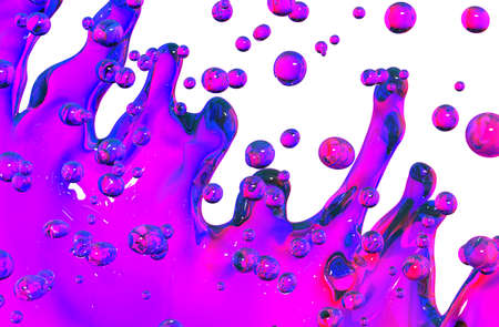 Pink water droplet splashing and creating small bubbles with blue and purple background