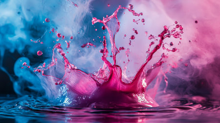A dynamic splash of vibrant pink liquid against a blue smoky background, creating an abstract composition with intense colors and movement, ideal for artistic and creative visuals.