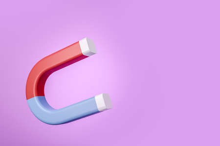 Horseshoe magnet on purple background, red and blue color. concept connection. copyspace. 3D rendering