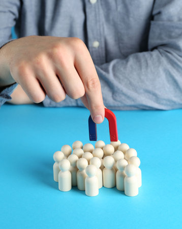 Close-up Of A Human Hand Attracting White Human Figures With Horseshoe Magnet On Blue Background