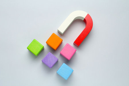 Magnet attracting colorful cubes on light gray background, flat lay