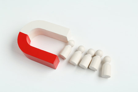 Magnet attracting wooden human figures on white background