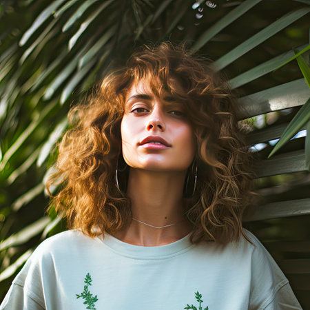 A young woman rests her chin on her hand, displaying her soft curly hair and thoughtful gaze. The warm, inviting background enhances her natural beauty and serene mood.