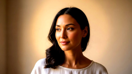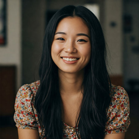 Portrait of an Asian woman indoors with calm smile and warm tones.