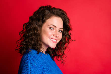 Profile photo of lovely cute lady wavy hairdo cheerful look camera flirty toothy shiny beaming smile wear blue knitted sweater pullover isolated red color background