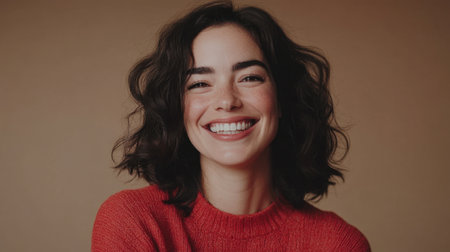 Joyful Young Woman Smiling with Warm Sweater on Neutral Background.