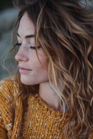 portrait of a girl with freckles on her face. hair that spills in the wind. beautiful and happy.