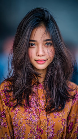 A young woman with long, flowing hair is smiling warmly while wearing a floral shirt. She is outdoors, with a blurred background that suggests a lively, bustling environment.