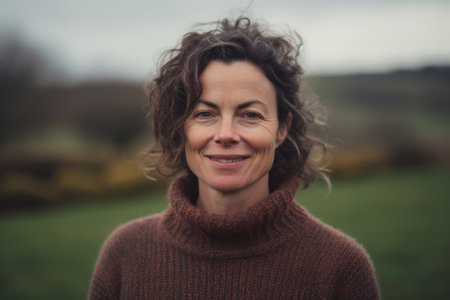 Portrait of smiling middle-aged woman in brown sweater in countryside