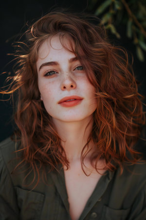 Portrait of ethnic redhead curly-haired woman with freckles.