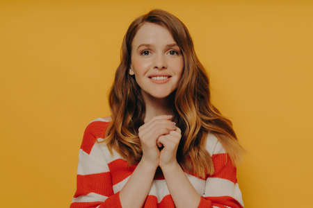 Thank you. Young happy woman feeling grateful, thankful and blessed while standing against yellow wall in studio, holding folded hands on chest, looking at camera with warm smile. Thankfulness concept