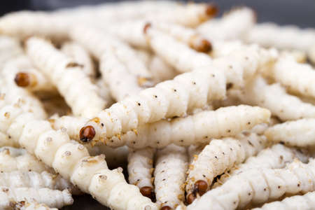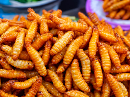 Fried silk worms delicious in street food in Thailand. They are deep fried until reaching a complete state of crispness, heavily salted, and eaten as a protein enriched snack.