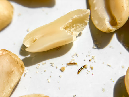 A macro photo of peanuts contaminated with crumbs and infested with small maggots, indicating improper storage.