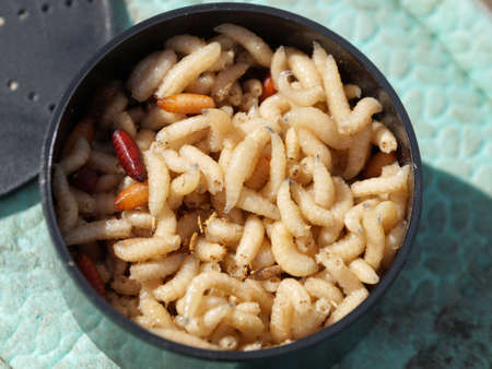 Macro maggots in a container, fish bait fishing
