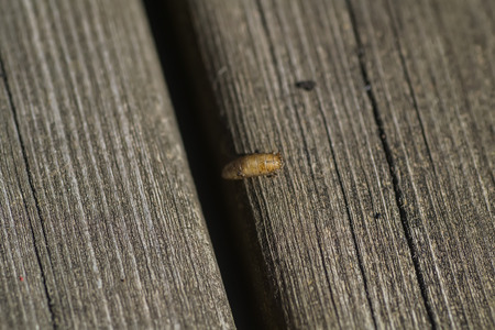 lumberjack beetle or barbel beetle larva on wood surface. Insect pests of wood.