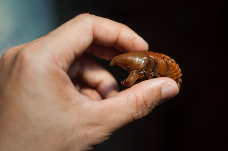 A man picks up a beetle worm in his hand.
