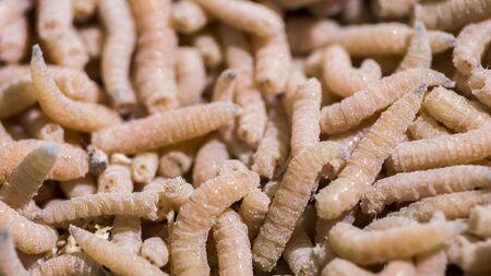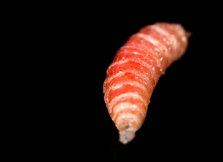 Maggot fly larva close up isolated on white background. Fishing bait.