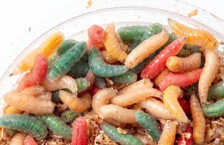 Multi-colored maggots in sawdust as a background. Macro.
