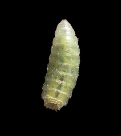 Green maggot isolated on black background. Macro.