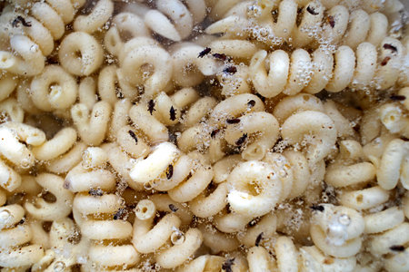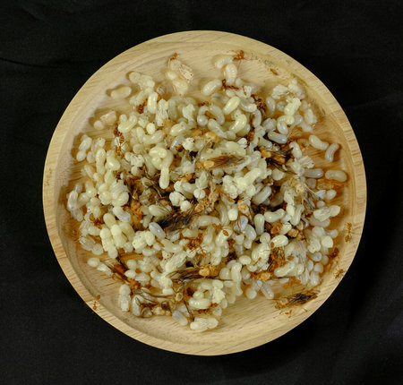Fried silk worms delicious in street food in Thailand. They are deep fried until reaching a complete state of crispness, heavily salted, and eaten as a protein enriched snack.