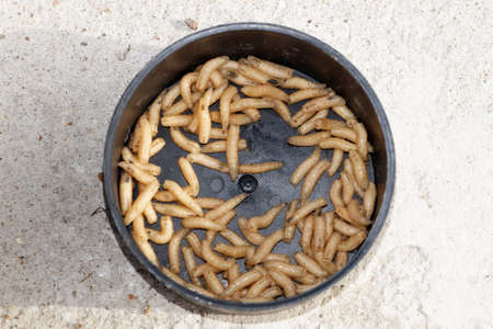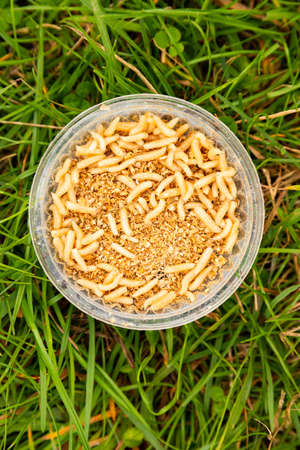 fly larvae in a plastic jar for fishing in the sun, maggots.
