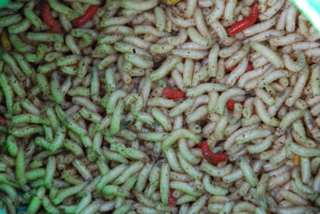 Creeping white fly larvae are used for fishing. Location by the river. Selective focus.