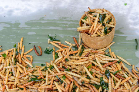 Fried worm bamboo edible, Bamboo Caterpillar, Thai street food. Source of protein, vitamins and mineral. Selective Focus