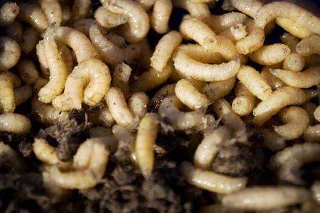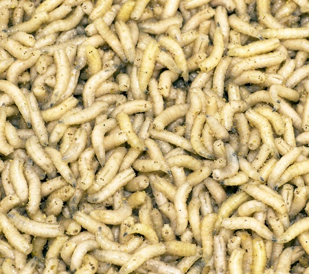 Maggot fly larva close up isolated on white background. Fishing bait.