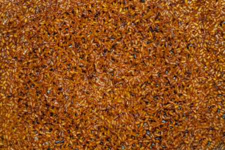 Spoiled rice grains gnawed by the granary pest rice weevil