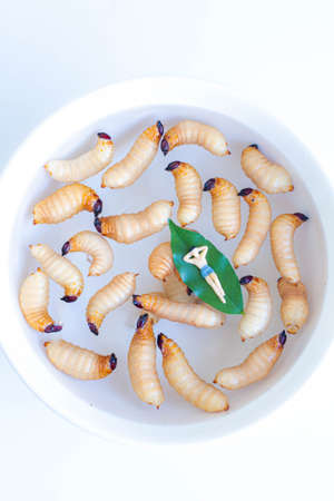 Grub Worms or Rhinoceros Beetle grow in soil on farm which agriculture gardening. Worm insects for eating as food, it is good source of protein edible. Environment and Entomophagy concept.