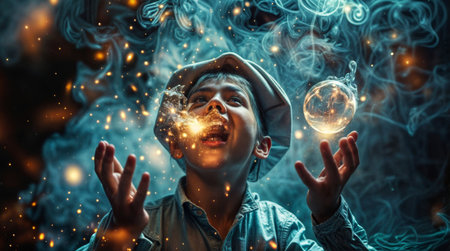 A young boy in a hoodie holding glowing golden particles in his hands, surrounded by a mystical atmosphere with floating sparkles against a dark background.