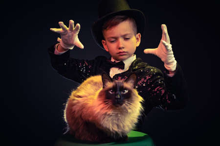 Cat and Magician kid illusionist boy in hat, magic show. costume mystery isolated black background