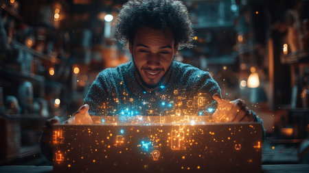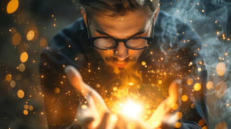 Man with glasses creating light magic in his hands. Mystical and enchanting scene.